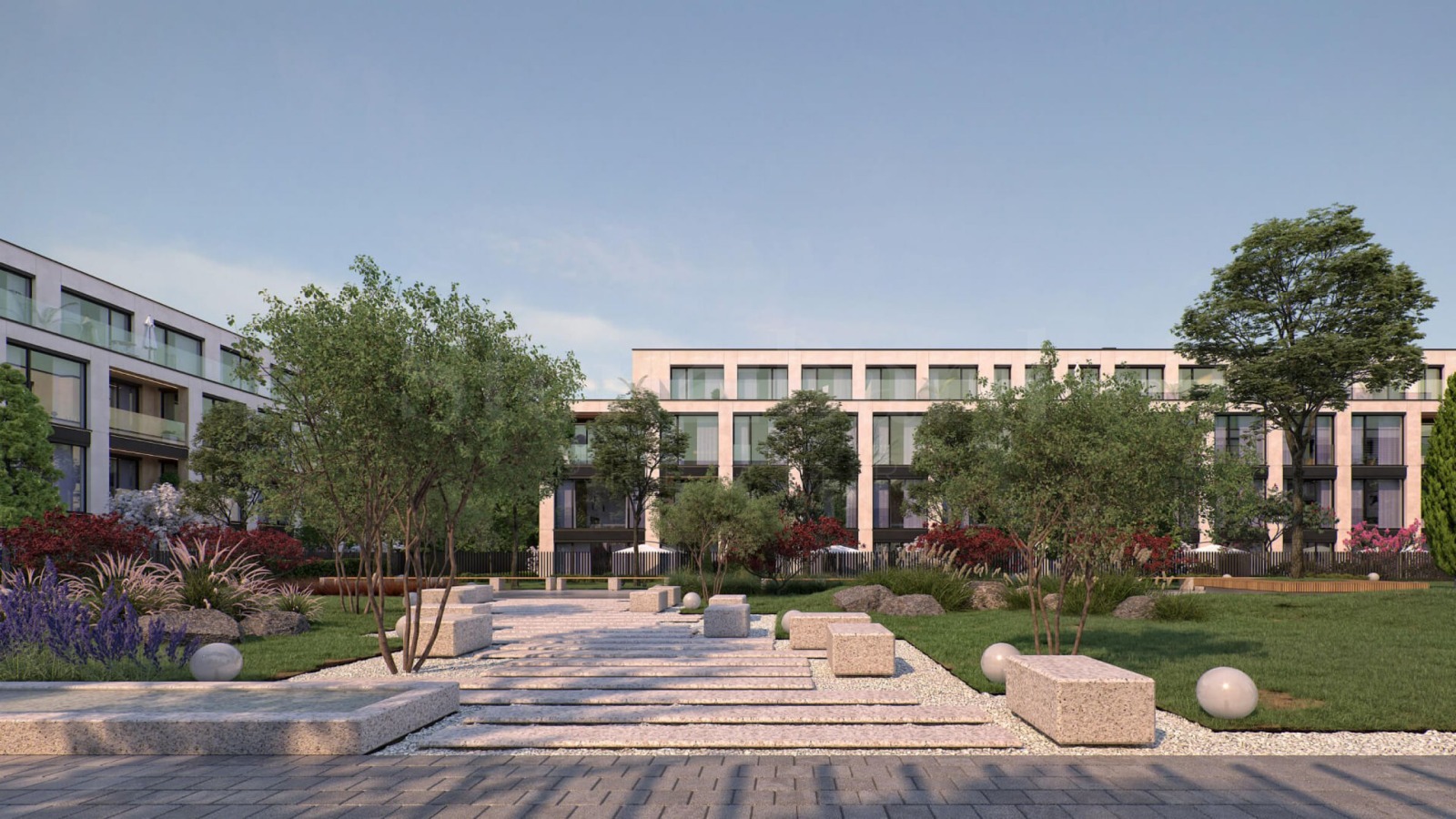Комплеkсът е част от модерен квартал с площ от 38 000 кв.м, отличаващ се с цялостно архитектурно планиране - съвременна архитектура на сградите, зона с ниско застрояване, богато озеленяване, нова подземна и надземна инфраструктура с красиво улично осветление, качествено павирани тротоари с озеленяване и модерни енергоефективни решения. Уютна обстановка, която предоставя възможност за прекарване на повече време със семейството на открито.