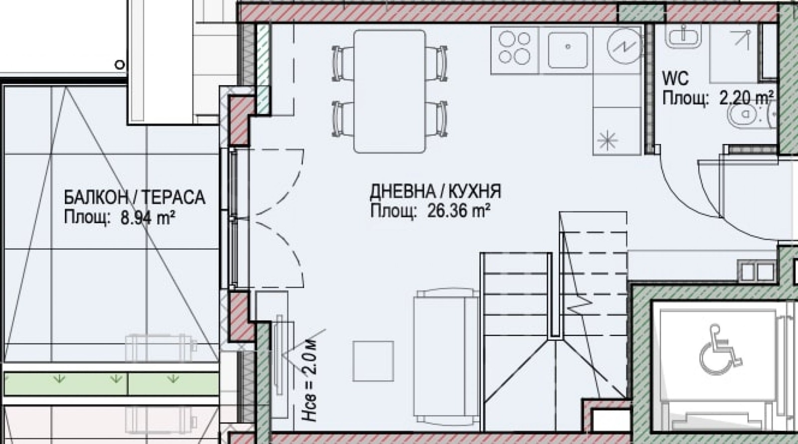 Конкретната оферта е за двустаен мезонет #А14, намиращ се на шести и седми жилищни етажи, с площ 98.57 м2, разпределен между просторна всекидневна с кухненски бокс и баня с тоалетна на първо ниво и спалня, баня с тоалетна и балкон на второ ниво.