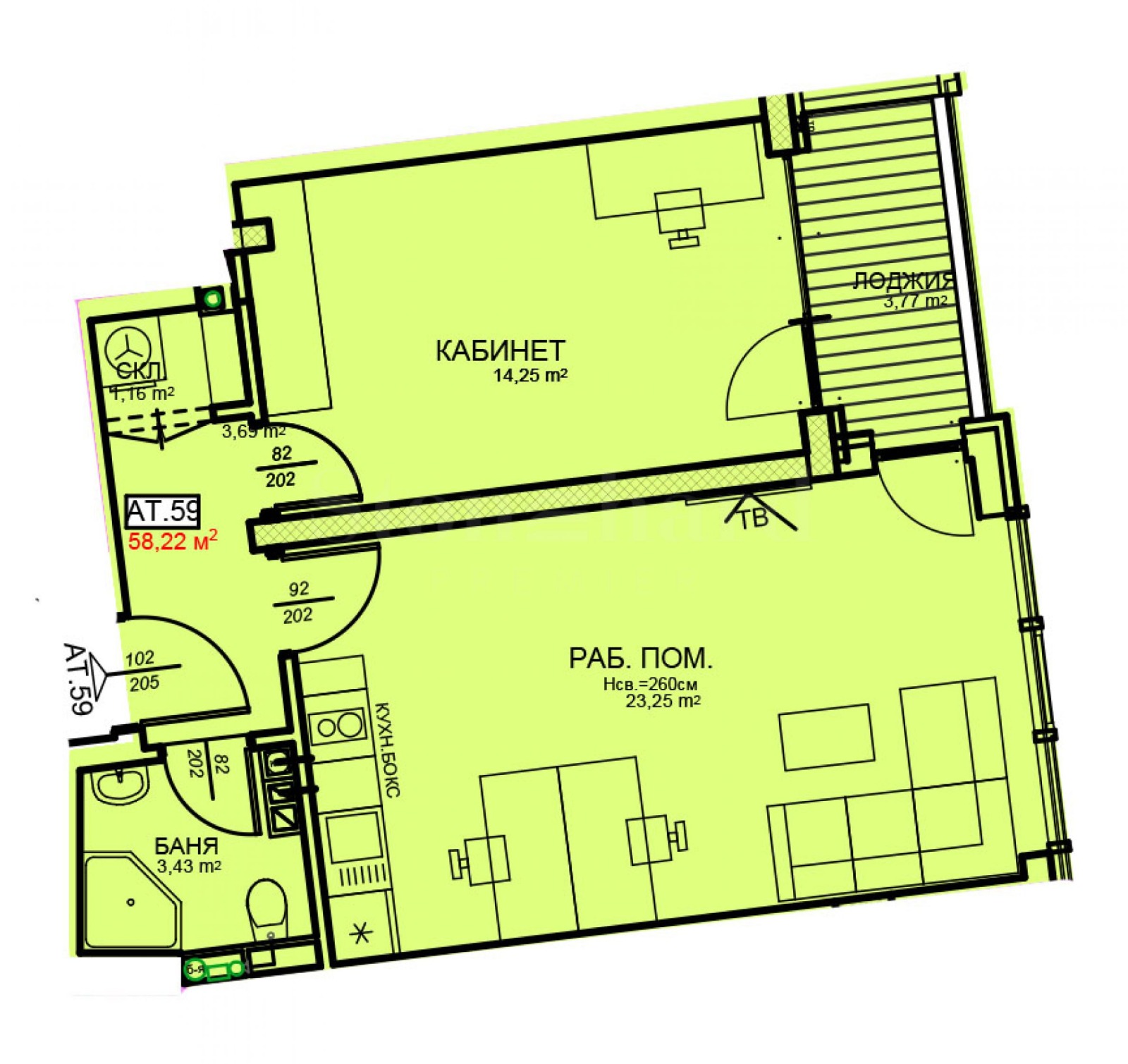 дневна с кухненски бокс: 23.25 кв.м;