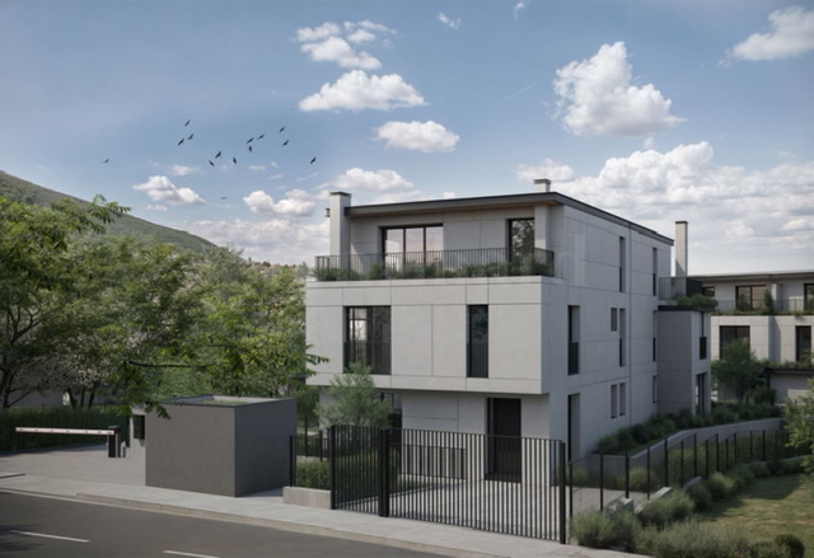 Комплексът е от затворен тип и се простира на терен от 2 137 кв.м. Състои се от две сгради с общо 6 редови къщи, с площи от 304.60 до 394.70 кв.м, всяка със самостоятелен двор и собствени, самостоятелно функциониращи инсталации. Архитектурата е модерна, с плоски покриви, панорамни прозорци и фасада с неутрални, квадратни форми и клинкерна облицовка на първите две нива. На територията на комплекса ще има вътрешни автомобилни алеи, алейно осветление и видеонаблюдение по периметъра на комплекса, както и контролиран достъп.