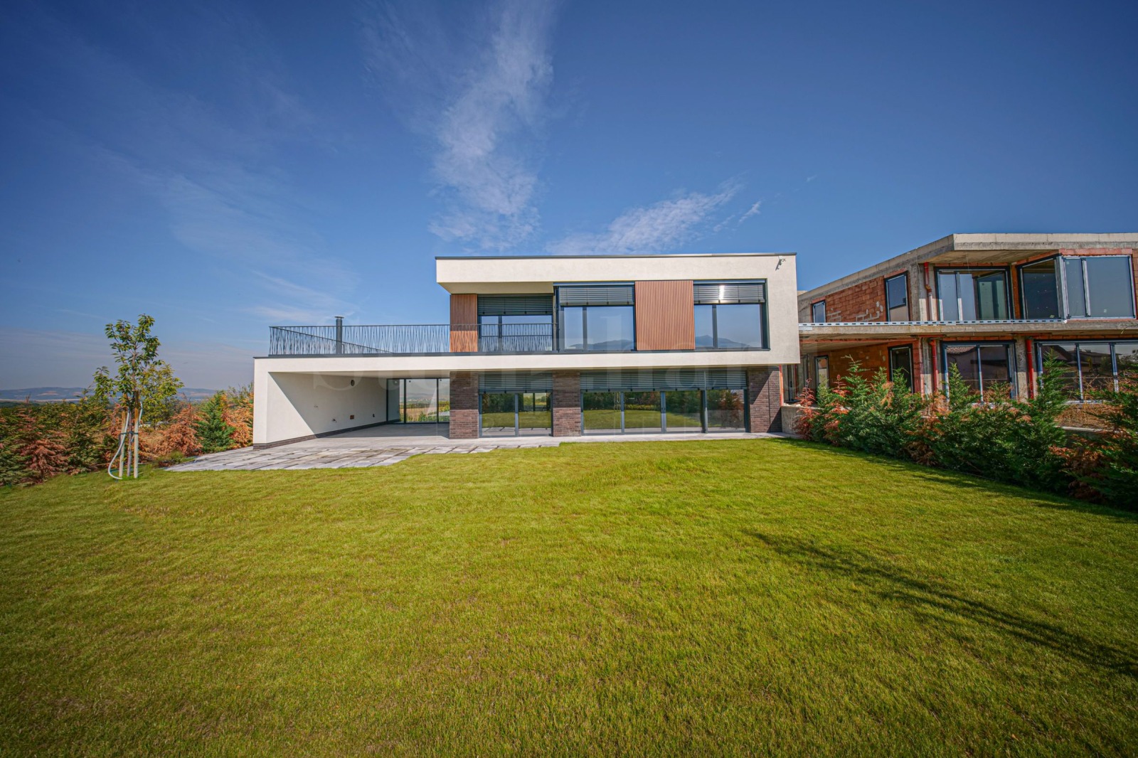 Втори етаж: родителска спалня с дрешник, баня и тераса, две спални, всички с южно изложение, две бани, на полу-ниво: студио с баня и тераса и мокро помещение.