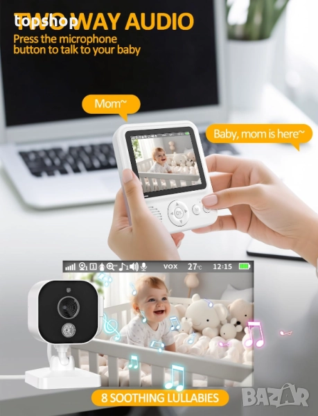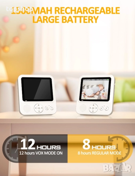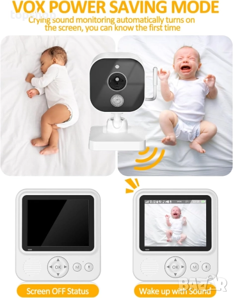Батерия 1500 mAh и VOX режим: Бебефонът с батерия 1500 mAh поддържа зареждане тип C, 4 часа за пълно зареждане и може да се използва около 8 часа при постоянна светлина, без да е необходимо често зареждане. Можете също да включите VOX режим, когато бебето спи спокойно, мониторът автоматично ще превключи в режим на пестене на енергия. Батерията може да се използва около 12 часа с пълно зареждане в VOX режим, което е много издръжливо.