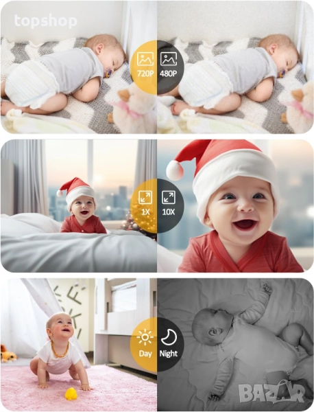 2,8-инчов 720p HD екран: Нашият бебефон има 2,8-инчов HD екран с резолюция 720p. Когато сте заети в хола, можете да наблюдавате бебето си в спалнята с ясното изображение на екрана. С функцията за 10-кратно увеличение можете да наблюдавате малките движения на бебето си по-отблизо. Можете също така ръчно да регулирате въртенето на камерата, за да осигурите цялостно наблюдение на бебето си.