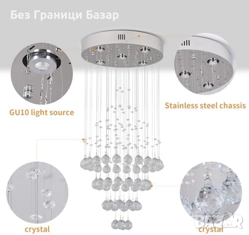 Нов Луксозен полилей с K9 кристали GU10, диаметър 40см, хром, осветлениe дом