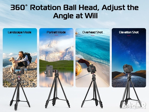 * Преносимост: Със собствено тегло от 0.6 kg (598 g) и компактни размери 47 cm в сгънато състояние, стативът е идеален за пътуване, влогове и селфита.