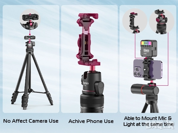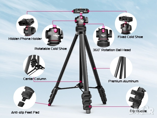 ULANZI TT51 е универсален, 2-в-1 статив, оптимизиран за мобилни телефони и компактни цифрови камери (до 600 g). Отличава се с технически спецификации и конструктивни характеристики, насочени към преносимост и гъвкавост.
