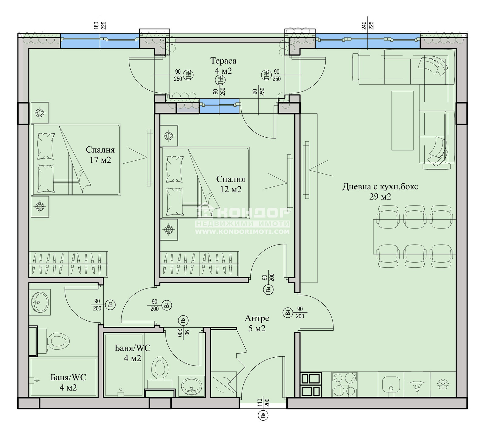 Оферта 65514: Представяме Ви малка и луксозна сграда от типа на Фамилна къща, проектирана така, че да създаде максимален комфорт и уют. Разположена в тиха улица с отлично отстояние от съседните имоти , сградата разполага с външни паркоместа и партерни гаражи. Жилището, което Ви представяме е със следното функционално разпределение: ПРОСТОРНА ДНЕВНА с трапезария и кухненски бокс -29кв.м; две спални ,едната от които 17кв.м ; тераса с излаз от трите стаи; две бани с тоалетни и антре с място за пералня .Изпълнението е осъществено с висококачествени материали и съвременни технологии, по европейски стандарт: петкамерна PVC дограма, червена Австрийска Тухла, масивна Блиндирана входна врата с 4-странно заключване, сензорно осветление, хидравлични асансьори с огледална кабина. Сградата разполага с партерни гаражи, подземни и наземни паркоместа. Възможност за Закупуване на разсрочено плащане в рамките на строителството или чрез Банков Кредит!!! ЧУДЕСНА ИНВЕСТИЦИЯ предвид качеството на строителство, което може да видите на приложените в галерията снимки от вече ГОТОВИ СГРАДИ на строителната фирма . Възползвайте се от възможността да живеете в малка бутикова сграда!!!ВИЖТЕ ОЩЕ ИЗГОДНИ ОФЕРТИ НА https://www.kondorimoti.com/ С ЕЖЕДНЕВНА АКТУАЛИЗАЦИЯ!