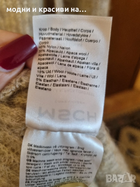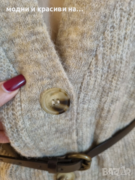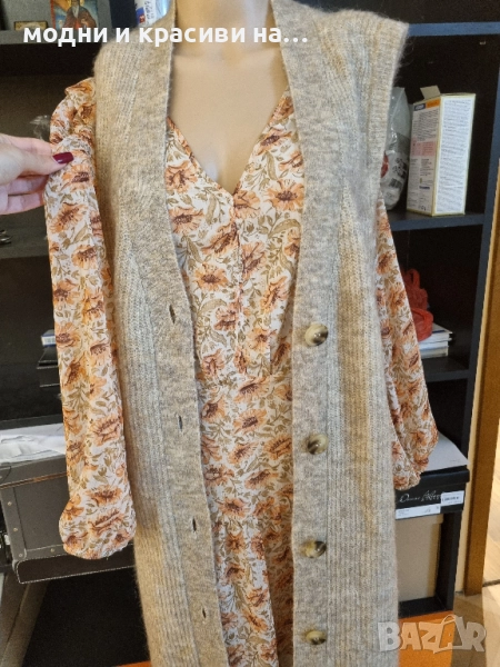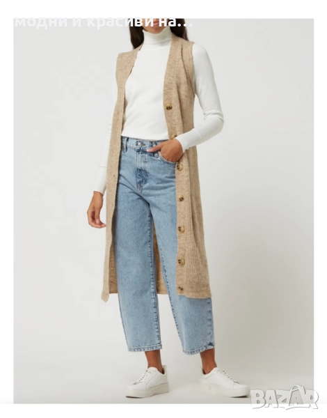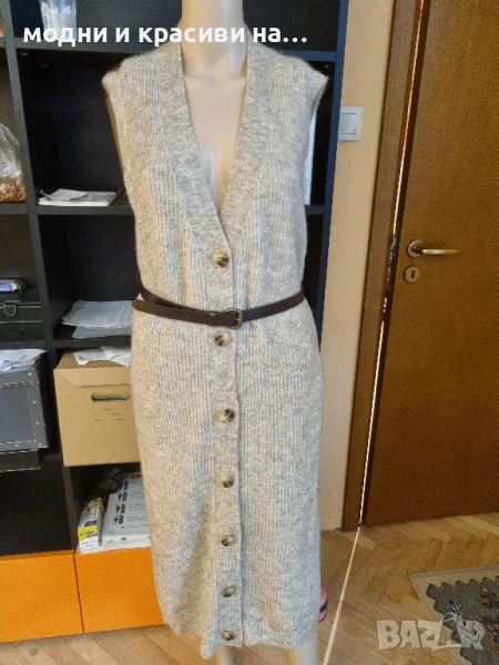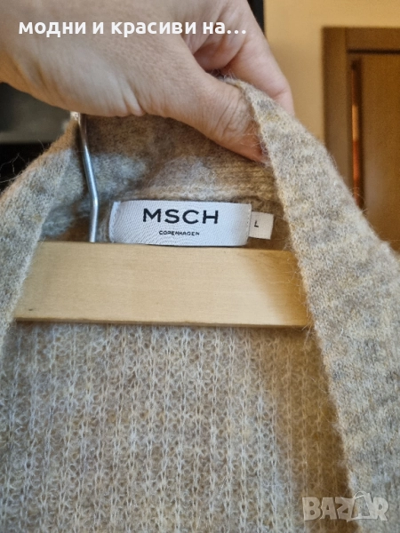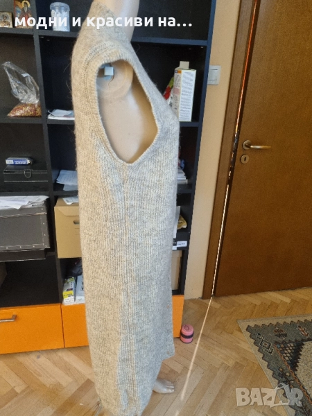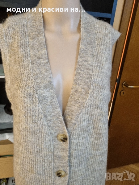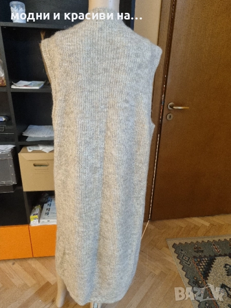 Дълъг елек на скандинавския бранд Mosch Copenhagen, размер L. Мек и топъл благодарение на съдържащите се в него алпака и вълна. Цветът е бежов меланж. Има много ефектни нишки в същата гама.Копчетата са в същата тоналност.