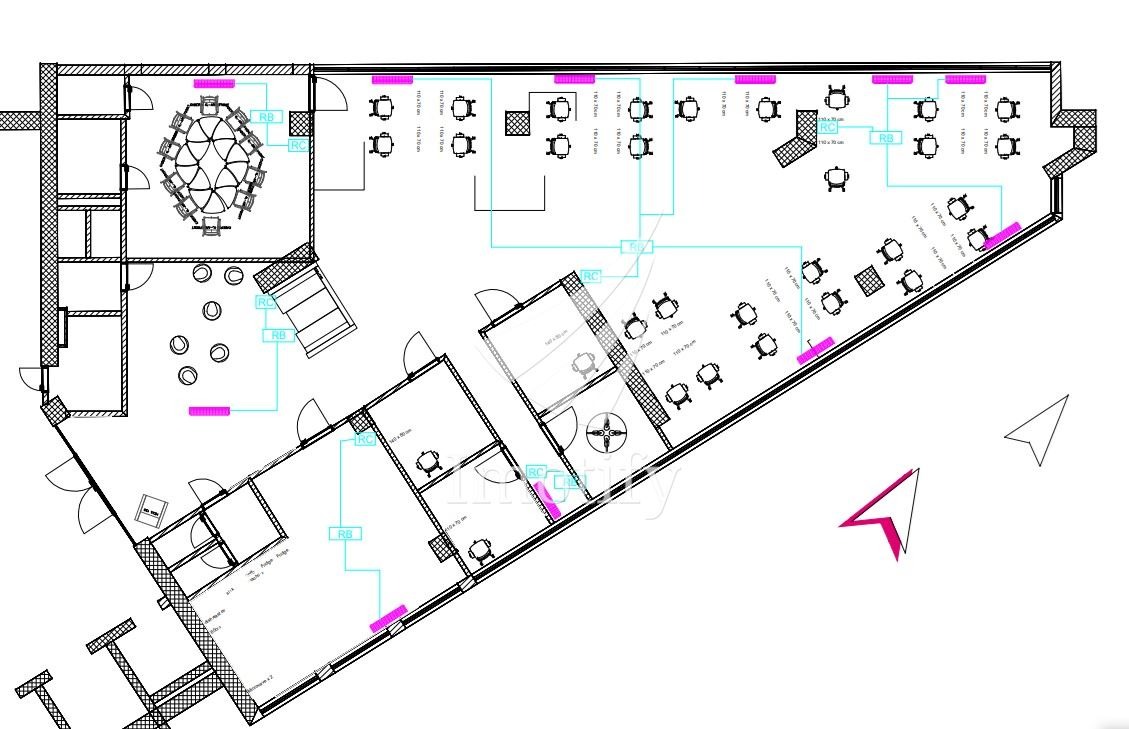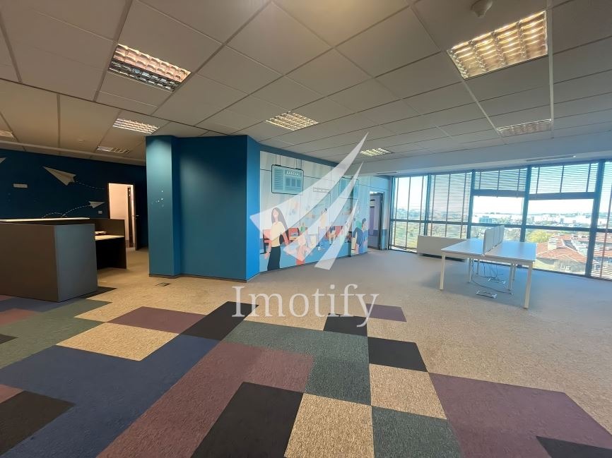 Разпределение: едно голямо Open space помещение, пет отделни работни кабинета, обособени със стъклени и гипсокартонени преградни стени, оборудвана кухня с трапезария и зала за почивка, представителна рецепция, сървърно помещение и четири санитарни възела. Офисът може да бъде преустроен изцяло като Open space или преграден според изискванията на наемателя.