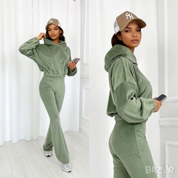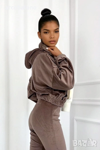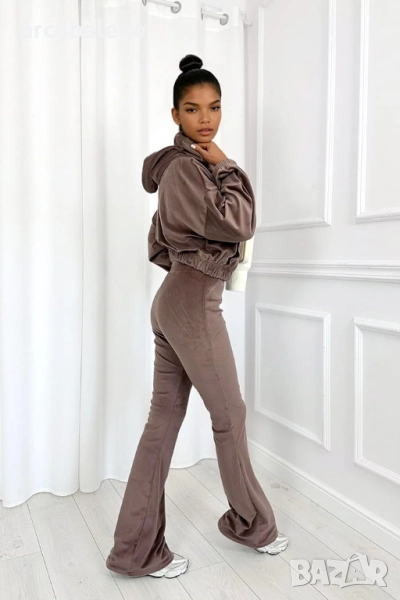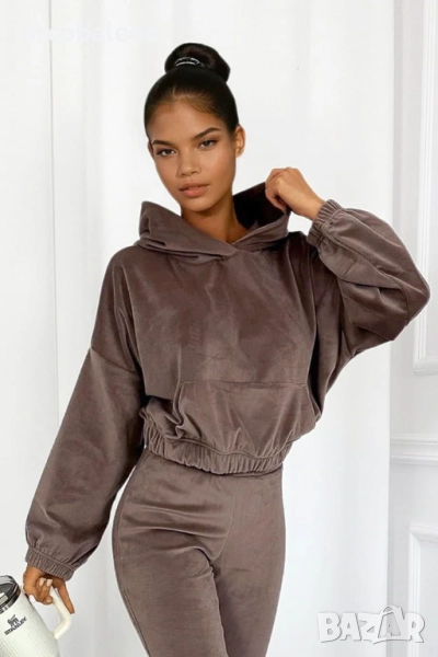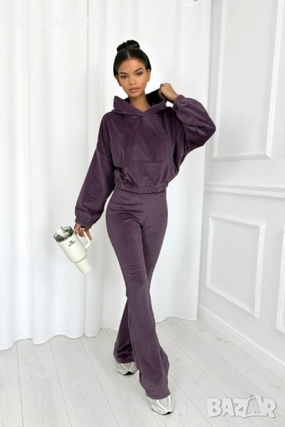 Открийте комплект, който съчетава ежедневен комфорт с модерен дизайн. Мека блуза с качулка и разкроени панталони, изработени от висококачествен велур, са перфектната комбинация от комфорт и женствена кройка. Деликатният блясък на материала добавя луксозно докосване, а еластичната материя гарантира свобода на движение през целия ден.