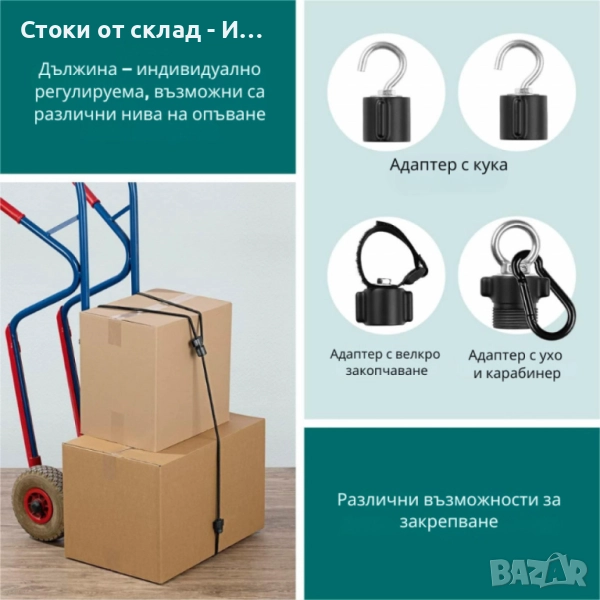 Употреба: закрепване на багаж, кашони, спортно и туристическо оборудване, мебели, палатки и др.