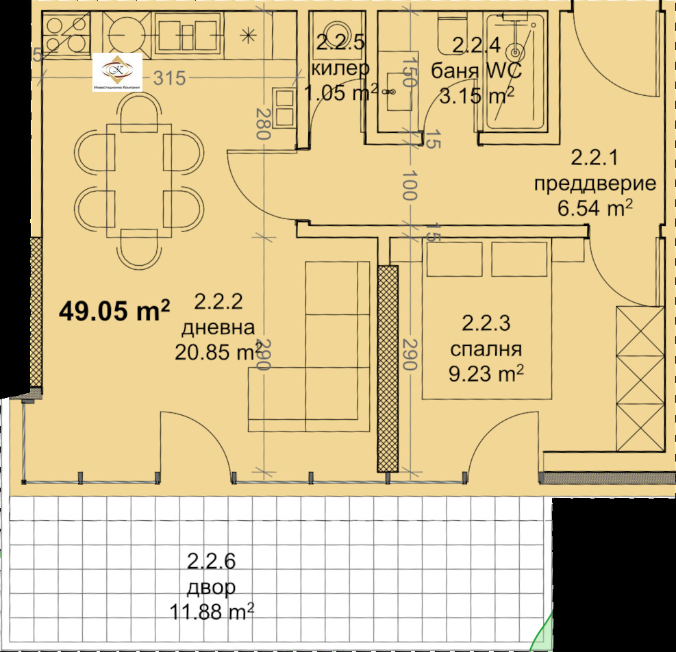 Апартамент A.2.2 е двустаен, разположен е на първия етаж в сграда 'БЕТА'. Състои се от преддверие, дневен тракт, спалня, баня-тоалет, килер и тераса -двор.