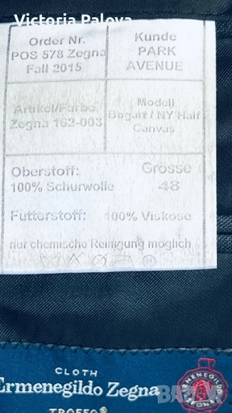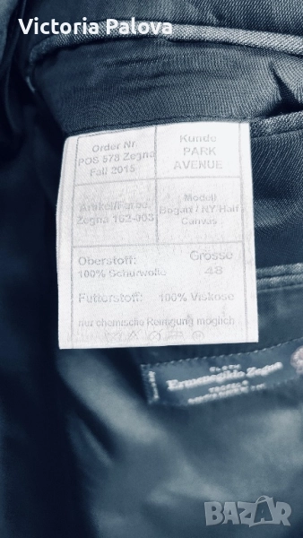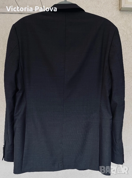 ZEGNA PARK AVENUE SARTORIAL - тъмносиво изкуство от 100% фина вълна, half-canvas конструкция за перфектна безупречна форма и издръжливост,slim- fit, V-ревери. Престижната линия PARK AVENUE SARTORIAL - символ на безупречен стил, фина изработка и неподражаема италианска елегантност, изработено от изключително висок клас вълна с идеален пад и мек допир, въплъщава онзи тип “тежък лукс”, който се разпознава без нужда от лого. Кройката е съвършено структурирана, подчертава фигурата и носи усещане за мярка и авторитет. Рамо - 46-7см, ГО - 54см, талия - 50см, дължина - 76,5см, ръкав - 65см.