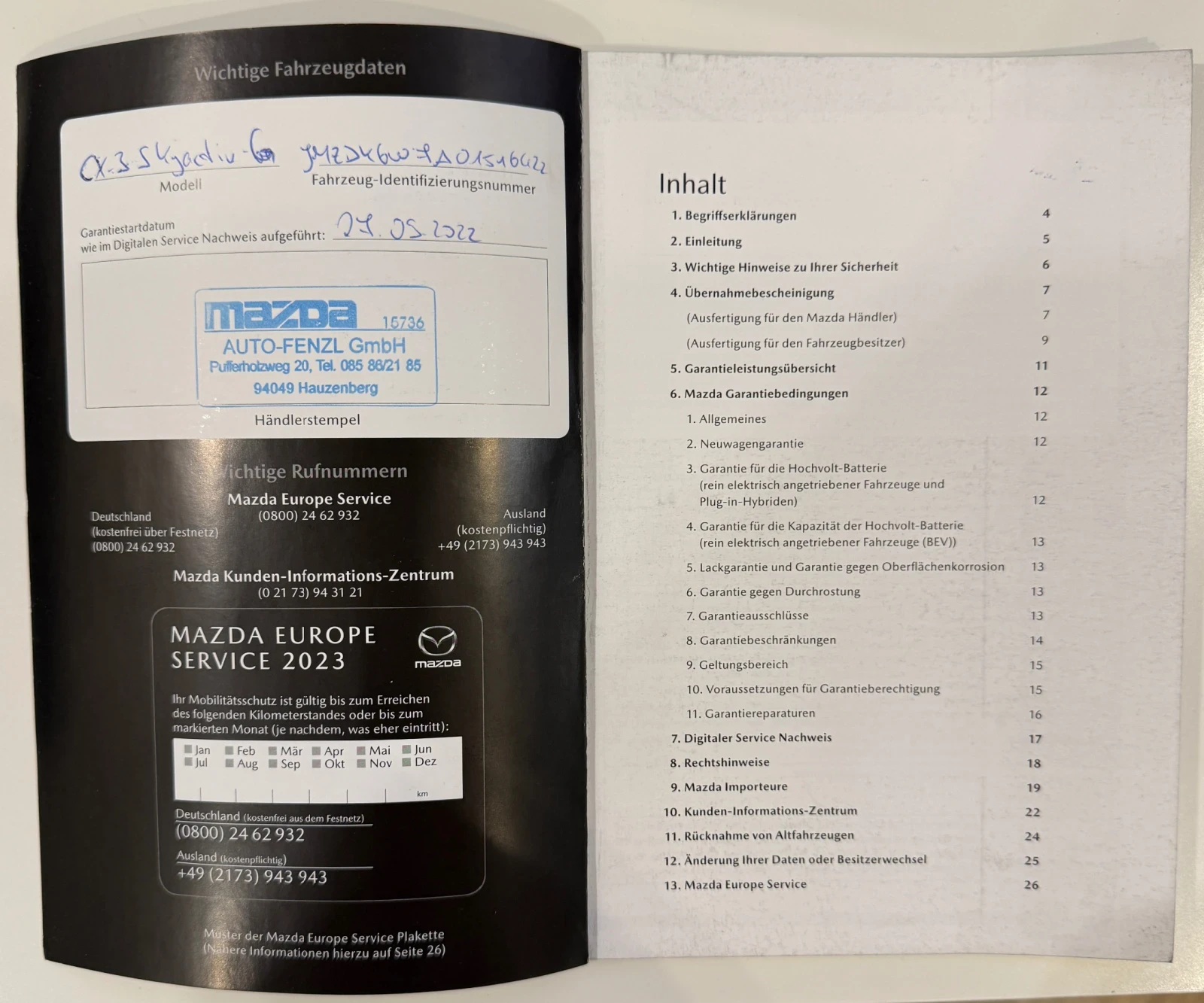 Автомобилът е в официална гаранция на Mazda до септември 2028 г. или до 150 000 км (в зависимост от това, кое настъпи по-рано). На 08. 10. 2025 г. при пробег 29 311 км е извършено планово техническо обслужване на автомобила при официален дилър на Mazda в Германия. Автомобилът е с валиден немски TUV до октомври 2026 г. , преминат през октомври 2024 г. Автомобилът е в отлично състояние много поддържан и изключително комфортен, благодарение на топ оборудването си. Проекция на показанията на уредите върху предното стъкло (Head-Up Display). Apple CarPlay. Android Auto. 360 камера. Паркинг радар, камера. Заден паркинг радар. Преден паркинг радар. Кожен волан. Подлакътник. Аудио-система BOSE. Система за контрол на дистанцията. Система за контрол на мъртвите зони. Система за контрол на умората на водача. Система за ограничаване на скоростта. Система за разпознаване на пътните знаци. Система за следене на пътната маркировка. Система за аварийно спиране. Автоматично затъмняващо се вътрешно огледало. Алуминиеви джанти (18" ) и летни гуми. Алуминиеви джанти (17" ) и зимни гуми.