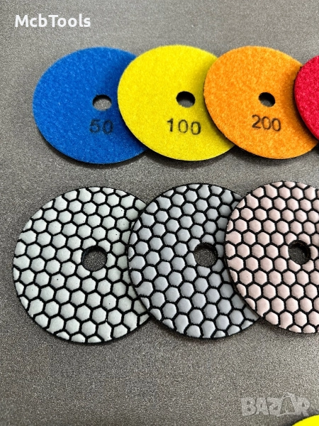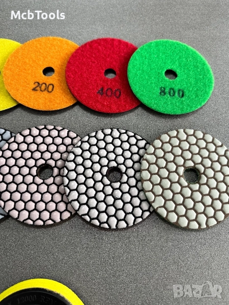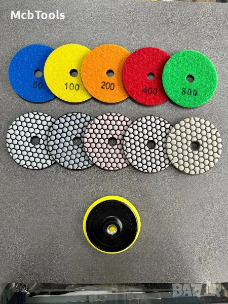 Диск за сухо полиране с велкро за мрамор, гранит, камък, композитни материали и бетонни повърхности. Обхват според зърнистотта: P50-100 за предварително полиране, когато се нуждае от голяма едрина. P200, 400 и 800 - за средно шлайфане. P1500 и 3000 са с най-ситно зърно и са подходящи за довършителни работи. Препоръчителна употреба за машина с регулируема скорост.
