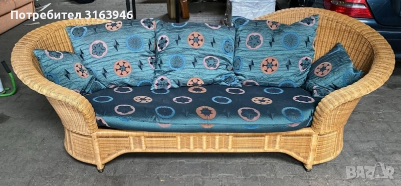 Елегантен комплект от ратан – триместен диван и два фотьойла, запазени в добър вид. Отличават се с извити линии и леки, но стабилни конструкции. Седалките и облегалките са с оригинални възглавници в синя тапицерия с флорални мотиви в оранжево и черно, придаващи свежест и уют.