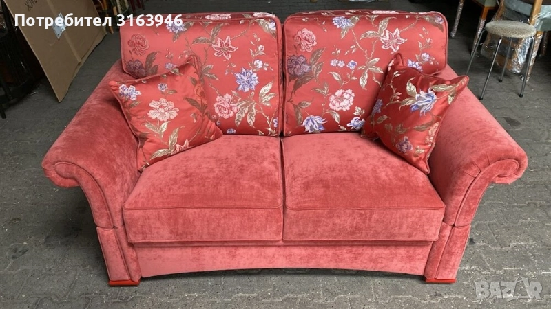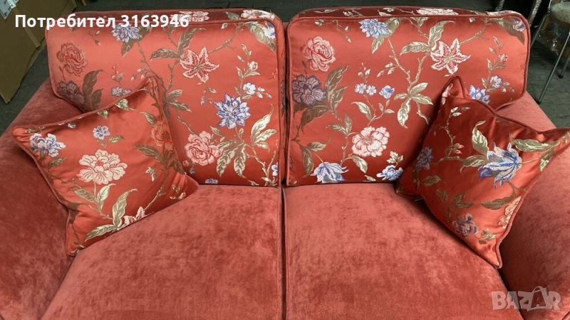 Елегантен ръчно изработен диван от престижната немска марка Schröno – символ на високо качество и неподвластен на времето дизайн. Отличава се с мека тапицерия в кадифено червен цвят, допълнена от декоративни възглавници и гръб с флорален десен. Формата с извитите подлакътници и солидната конструкция подчертават класическия характер на модела.