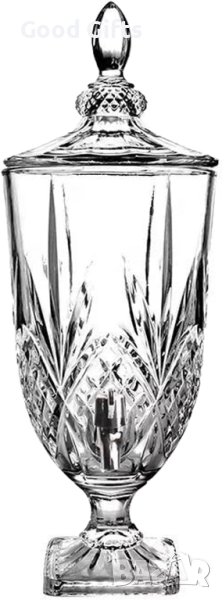 Изработен от висококачествено дебело стъкло с фина гравюра, този съд съчетава функционалност и луксозен вид. Металното кранче осигурява плавно наливане без разливане, а плътно прилягащият капак предпазва напитките от прах и замърсяване. Идеален избор както за официални поводи, така и за ежедневна употреба.