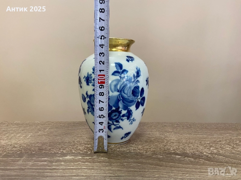 Продава се оригинална порцеланова ваза Royal Porzellan Bavaria KPM (Германия) с височина 15 см. Ръчна изработка в класически стил с дълбок кобалтов цветен мотив и позлатен кант. Отлично състояние – без отчупвания и пукнатини. Идеална за колекция, подарък или стилна декорация на интериора. Уникален немски порцелан, проверено качество, ръчна изработка и истинска кобалтова глазура (Echt Cobalt).
