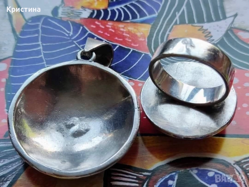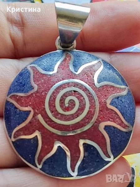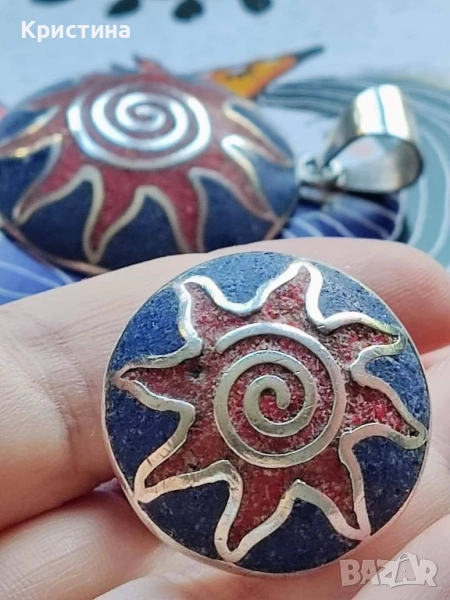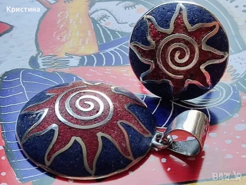 Красив сребърен комплект Слънце с червен корал и Лапис лазули. Проба: 925. Тегло: 30 гр. Състои се от: