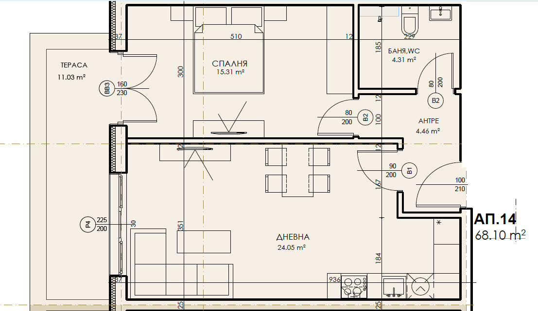 - 68.10 кв.м. чиста площ, с общи части 79.38 кв.м., като дневната е с чиста площ 24.05 кв.м., голяма тераса 11.03 кв.м., спалня 15.31 кв.м., баня с тоалетна 4.31 кв.м.,, антре 4.46 кв.м..