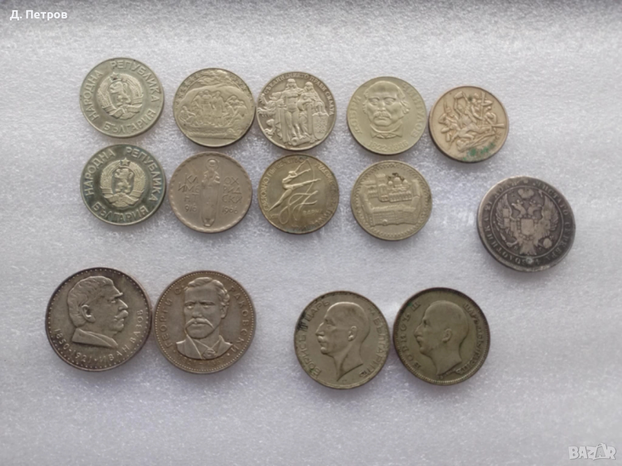 монети от 2 и 5 лева, 100 лева от царска България и сребърна монета рубль 1837 година