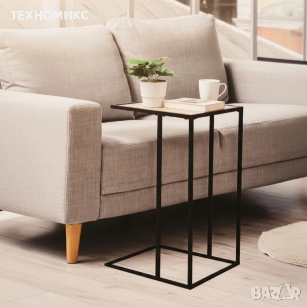Масичката впечатлява с минималистичен силует — прави линии, тънък, но устойчив метален кант и квадратна основа, която придава усещане за геометричен ред. Плотът е в светъл дървесен нюанс, който „смекчава“ метала и внася топлина до сив диван, светла стена или бетонен под. Черната рамка добавя контраст и визуална чистота, така че масата да стои стилно, но ненатрапчиво. С-образната форма е не само красива, а и функционална — позволява да „вмъкнеш“ основата под мебела и да доближиш плота до тялото си за удобна работна или сервизна позиция.