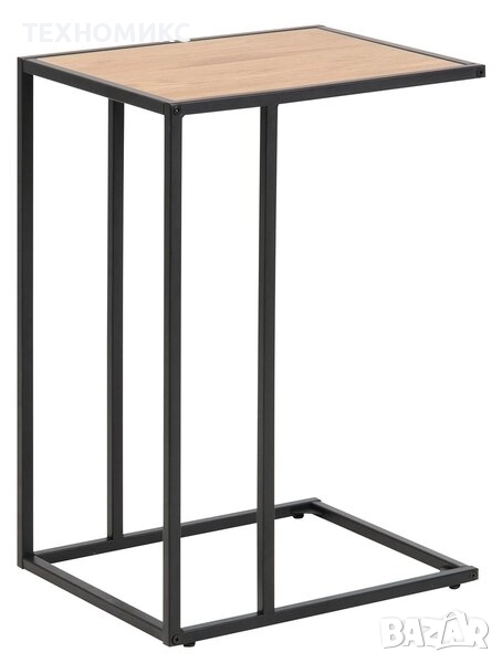 Масичката впечатлява с минималистичен силует — прави линии, тънък, но устойчив метален кант и квадратна основа, която придава усещане за геометричен ред. Плотът е в светъл дървесен нюанс, който „смекчава“ метала и внася топлина до сив диван, светла стена или бетонен под. Черната рамка добавя контраст и визуална чистота, така че масата да стои стилно, но ненатрапчиво. С-образната форма е не само красива, а и функционална — позволява да „вмъкнеш“ основата под мебела и да доближиш плота до тялото си за удобна работна или сервизна позиция.