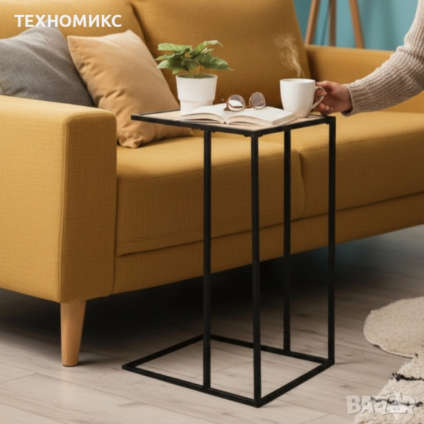 Практична С-форма: металната база се плъзга под дивана или креслото и приближава плота до теб — идеално за лаптоп, книга или закуска пред телевизора.