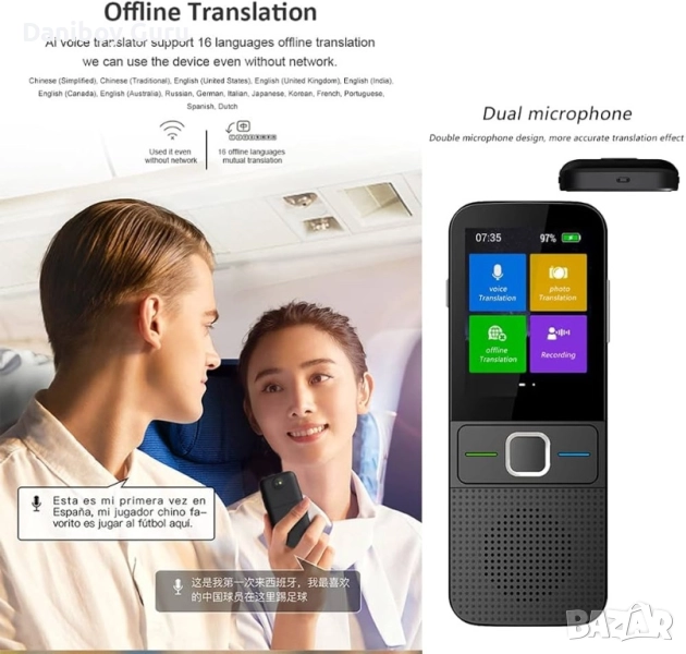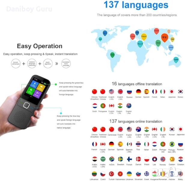 Двупосочен превод: 137 езика онлайн, 12 езика офлайн, превод с камера от 45 езика. Нашето преводаческо оборудване е идеално за превод на различни акценти от различни страни, като български, китайски, немски, арабски, английски, испански и др.