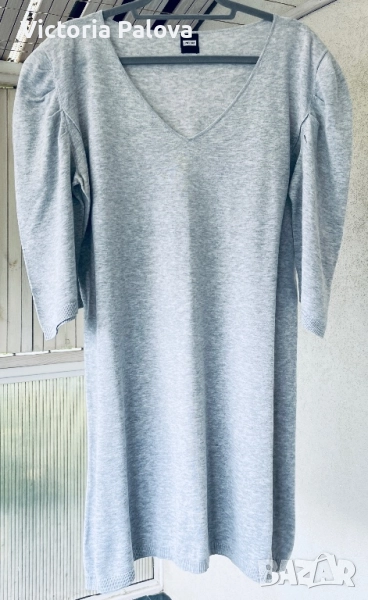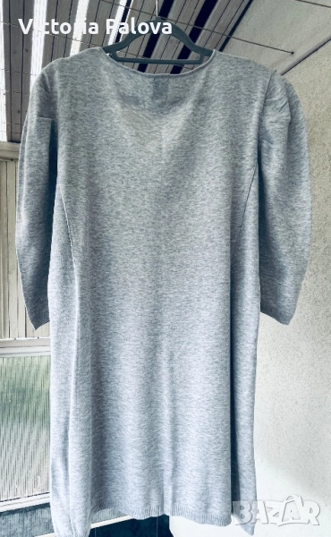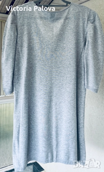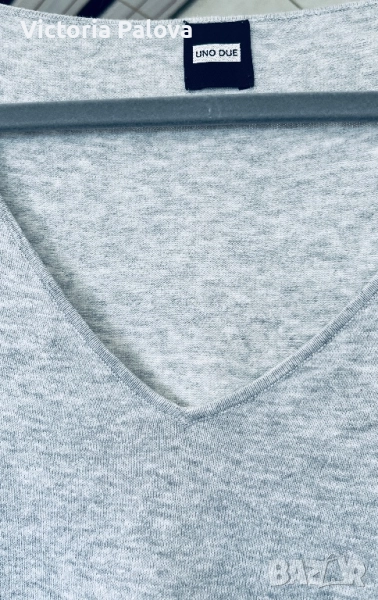 Uno Due е марка за дамско облекло, вдъхновена от модерната жена, която цени комфорта и стила в ежедневието, специализирана в качествен knitwear с акцент върху меки материали и естествени тонове. Комфорт с V-деколте, 3/4 пухкави ръкави с леки подплънки, млечно сив цвят, 100% мек трикотажен памук. Рамо - 48см, ГО - 58см, дължина - 89см, ръкав - 47см.