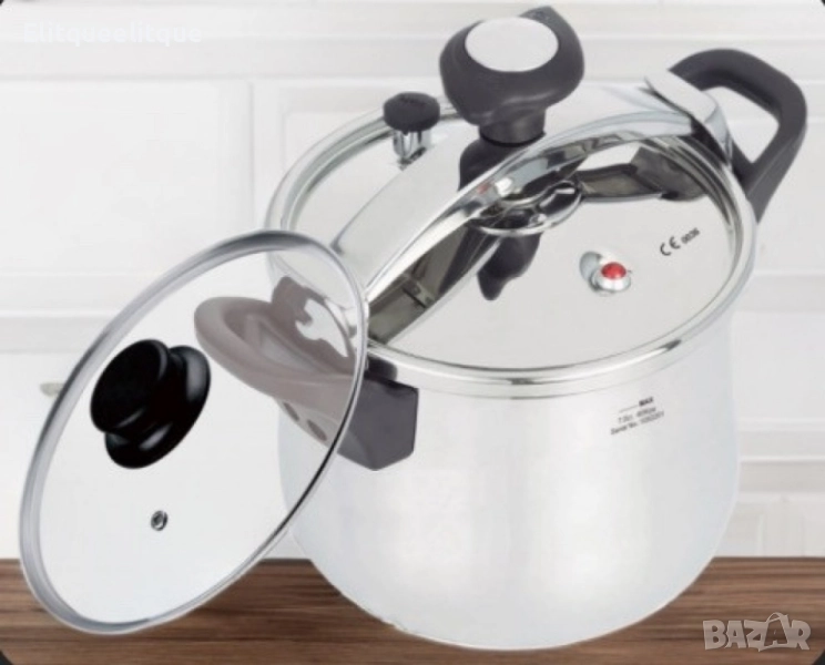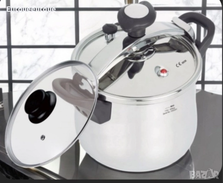 Тенджера под налягане. Вместимост: ,7 л. (Размери: диаметър-24 см., височина-16.3 см.); Вместимост: 9 л. ( Размери: диаметър-26 см., височина-18.1 см.); Специално, многослойно, термо дъно за оптимална топлопроводимост. Подходяща за всякакъв тип котлони: газови, стъкло-керамични, електрически, халогенни и индукционни. Ергономични, бакелитени дръжки за защита на ръцете и за лесна употреба. Дизайн със супер гладки повърхности за предотвратяване наслояването на храна и мазнини и за лесно почистване. Нормално налягане при готвене: 60kPa . Предпазен клапан за налягане: макс 70-90kPa. Специален капак с въртяща се ръкохватка за отваряне за допълнителна защита. Силиконов уплътнителен пръстен. Допълнителен стъклен капак с бакелитена дръжка, и силиконово уплътнение в комплекта. Подходяща за съдомиялни машини. Цвят: Сребрист.