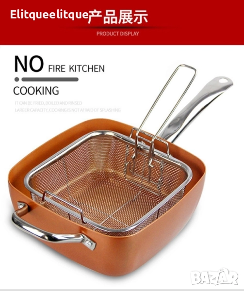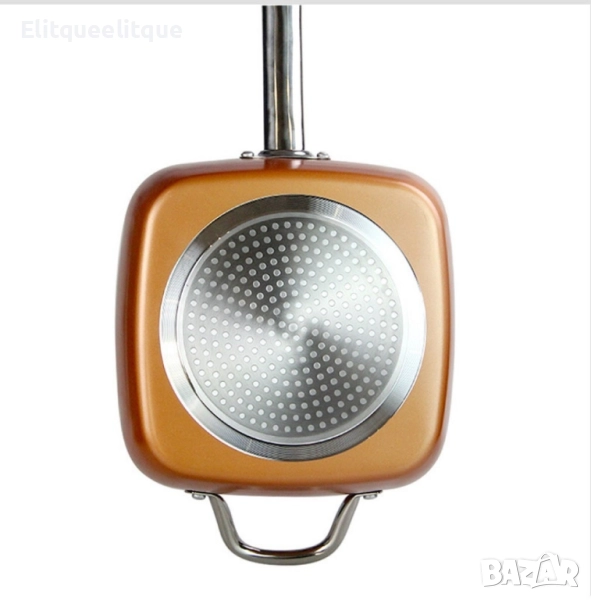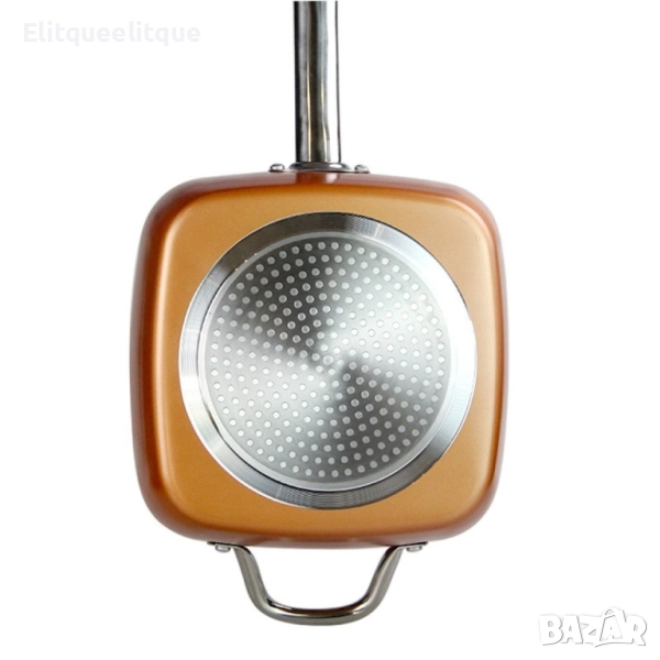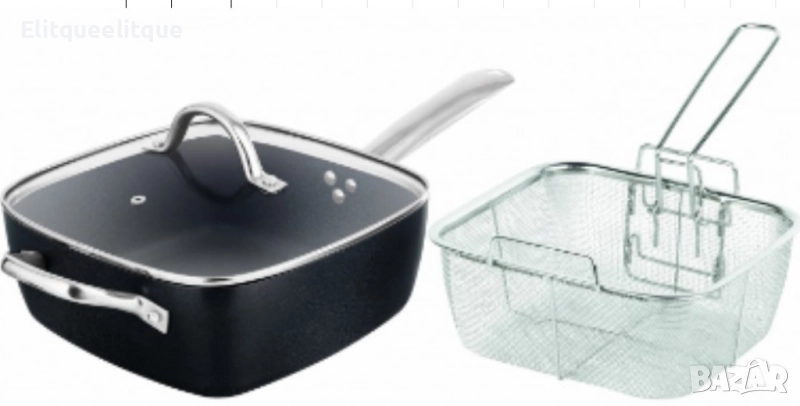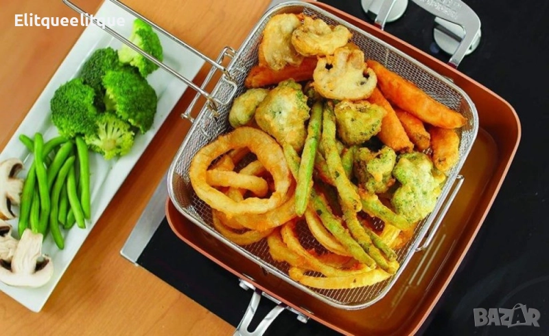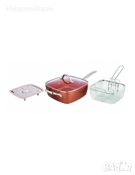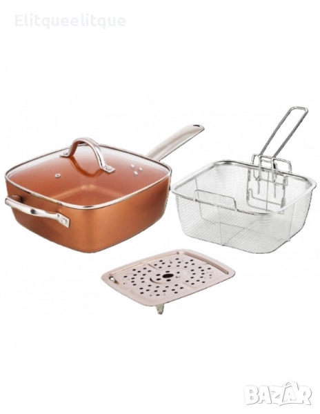 Алуминиева квадратна тава с кошница за пържене и съд за пара Oliver Voltz - Висококачествен издръжлив алуминиев квадратен съд. - Медно незалепващо покритие на повърхността. - Дръжки от неръждаема стомана, монтирани с нитове върху тялото на готварския съд за допълнителна здравина. - Висококачествен стъклен капак с отвор за пара. - Съдът е подходящ за широка гама от източници на отопление: газ, халоген, електричество, стъклокерамика и индукция. - Съдът е перфектен за готвене без мазнина и изключително лесен за почистване. - Подходящ е за съдомиялна машина. - Размери: 24 х 24 х 9.5см. - Вместимост- 4.3 л. Внимание: Само за домашна употреба! Цвят: Черен, оранжев