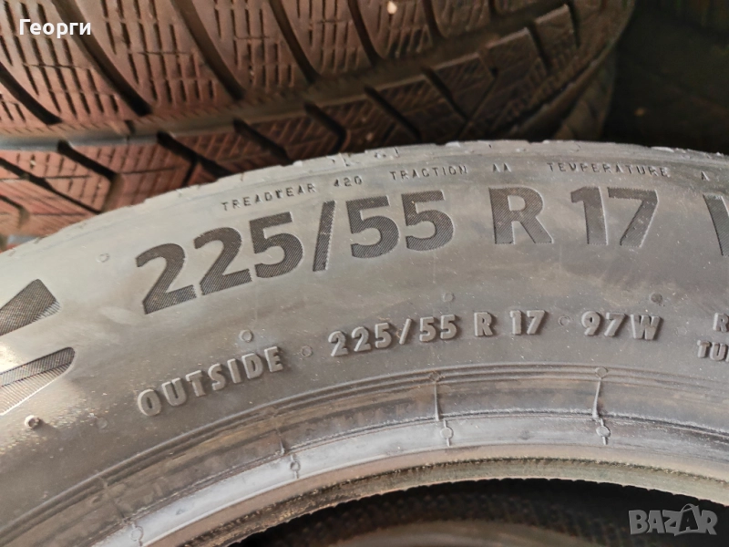 4бр.Contiental ,225/55/17, ДОТ 5021, 6.3mm грайфер. Гумите са перфектни, нови, без забележки, проверени са машинно за кривини, балони!! Разполагаме с всякакъв размер нова и втора употреба гуми от 14-22 цола за автомобил, джип и бус.