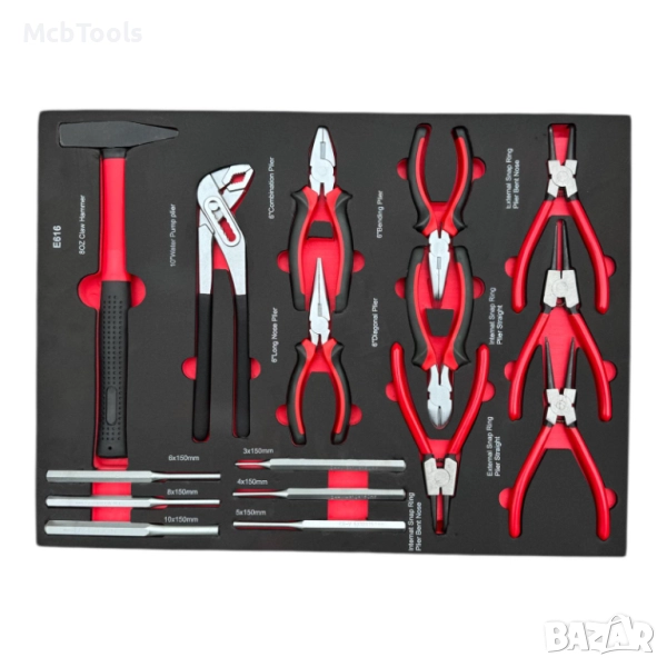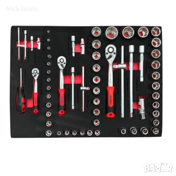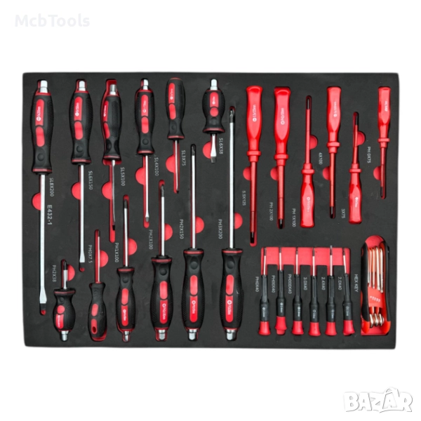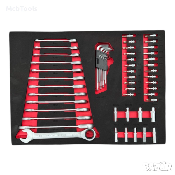 Шкафът разполага с 6 чекмеджета, от които 4 са напълно окомплектовани с инструменти, подредени в маслоустойчива EVA пяна за перфектна организация и защита. Оборудван е с централно заключване за сигурност и лагерни водачи на чекмеджетата, осигуряващи плавно и безпроблемно отваряне. Допълнителното странично отделение за масла и консумативи предлага повече удобство и пространство за съхранение.