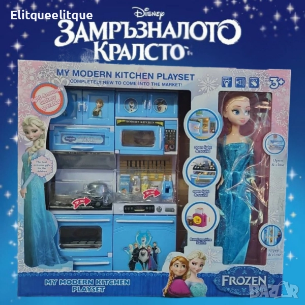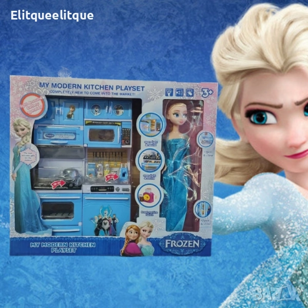 Тип продукт: Детски кухненски комплект с кукла Елза; Марка: Frozen (вдъхновен от „Замръзналото кралство“); Възрастова група: Подходящ за деца над 3 години; Материал: Висококачествена пластмаса; Ефекти: Светлинни и звукови ефекти; Захранване: Работи с батерии (не са включени в комплекта); Цвят: Преобладаващи сини нюанси с изображения на героите от филма; Размери на комплекта: Компактен и лесен за сглобяване; Аксесоари: Тенджери, чаши, бутилки, прибори и други кухненски принадлежности; Допълнителни функции: Отварящи се вратички на уредите, светещи и озвучени секции.