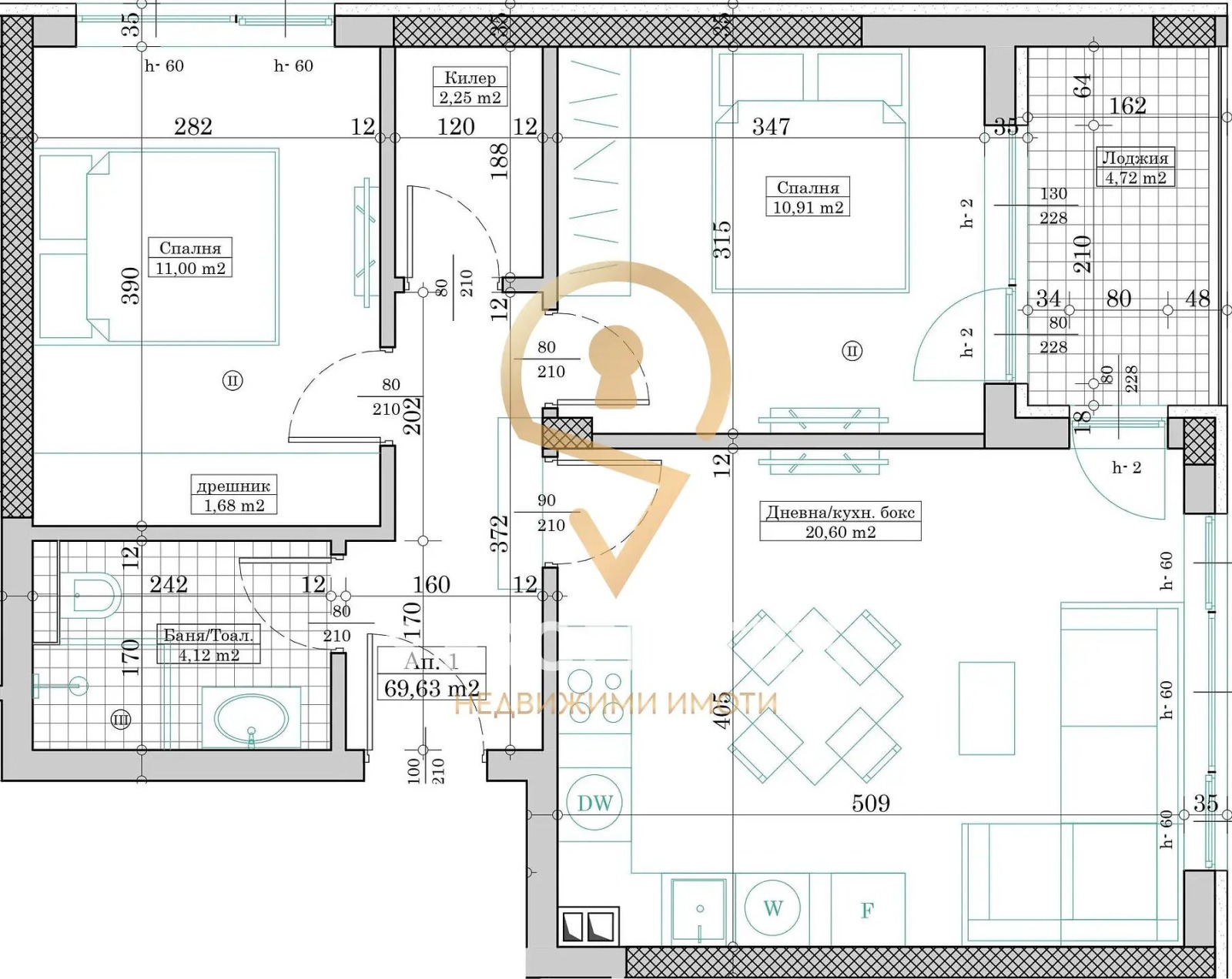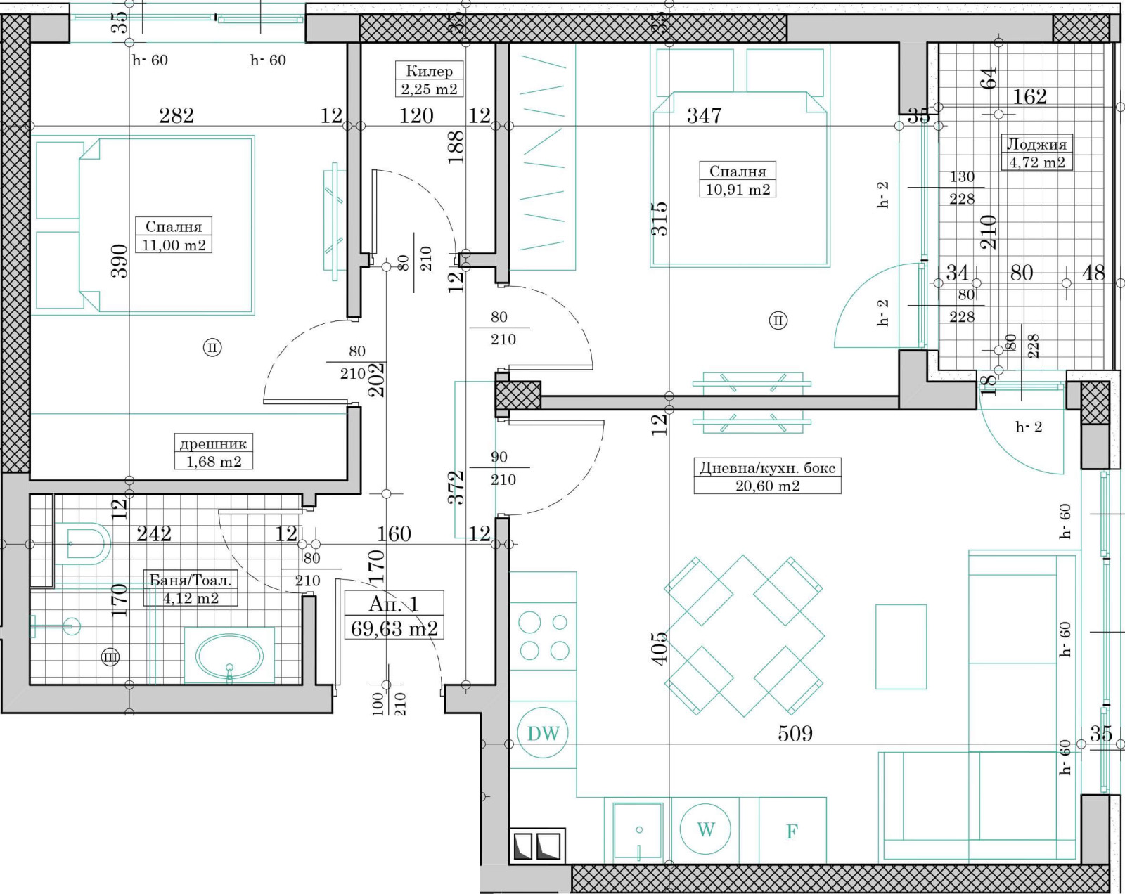 Имотът е на втори етаж в девететажна сграда, с тухлена конструкция, която осигурява отлична изолация и дълготрайност. Състоянието на имота е БДС, което дава възможност на новите собственици да го завършат по свой вкус. Апартаментът разполага с две спални, една баня и тоалетна, както и с просторна дневна, която е идеална за семейни събирания. Изложението на имота е изток, което осигурява приятно осветление през целия ден.