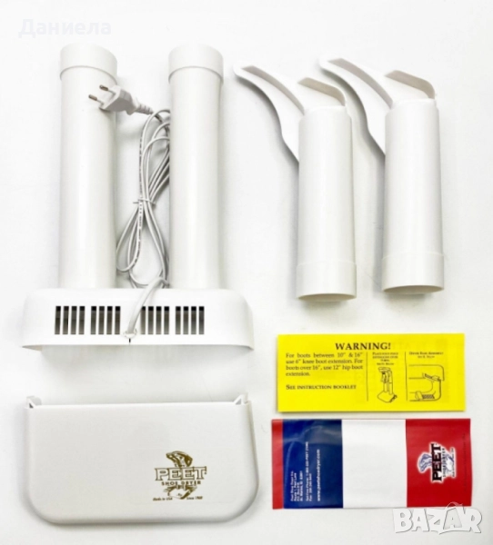 Захранване: стандартен електрически контакт; Метод на сушене: тиха термична конвекция (без вентилатор и без агресивна температура); Типове обувки: ски/сноуборд обувки, кънки, туристически и работни ботуши, ежедневни обувки; Време за сушене: ориентировъчно 6–8 часа според материала и степента на намокряне; Материали: износоустойчива, термоустойчива пластмаса; стабилна основа; Включени в комплекта: основа PEET с две колони, 2 удължителя за високи ботуши, захранващ кабел, потребителско ръководство; Гаранция: 12 месеца.