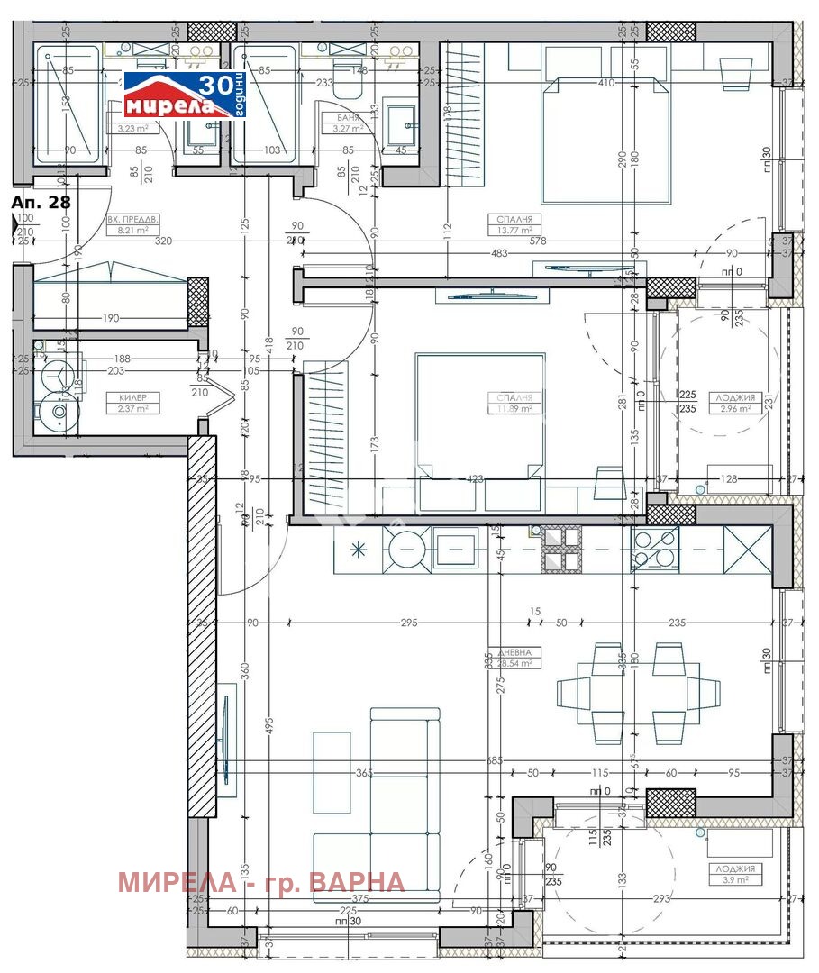 Апартаментът се намира на пети етаж и се състои от: дневна с кухненски бокс, 2 спални, 2 бани с тоалетна, килер, входно преддверие и 2 ловджии.