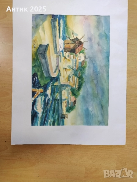 Оригинален акварел, изобразяващ живописния бряг на Стария Несебър — едно от най-красивите исторически места в България. На картината се виждат морето, старите къщи и известната мелница – символ на Несебър.