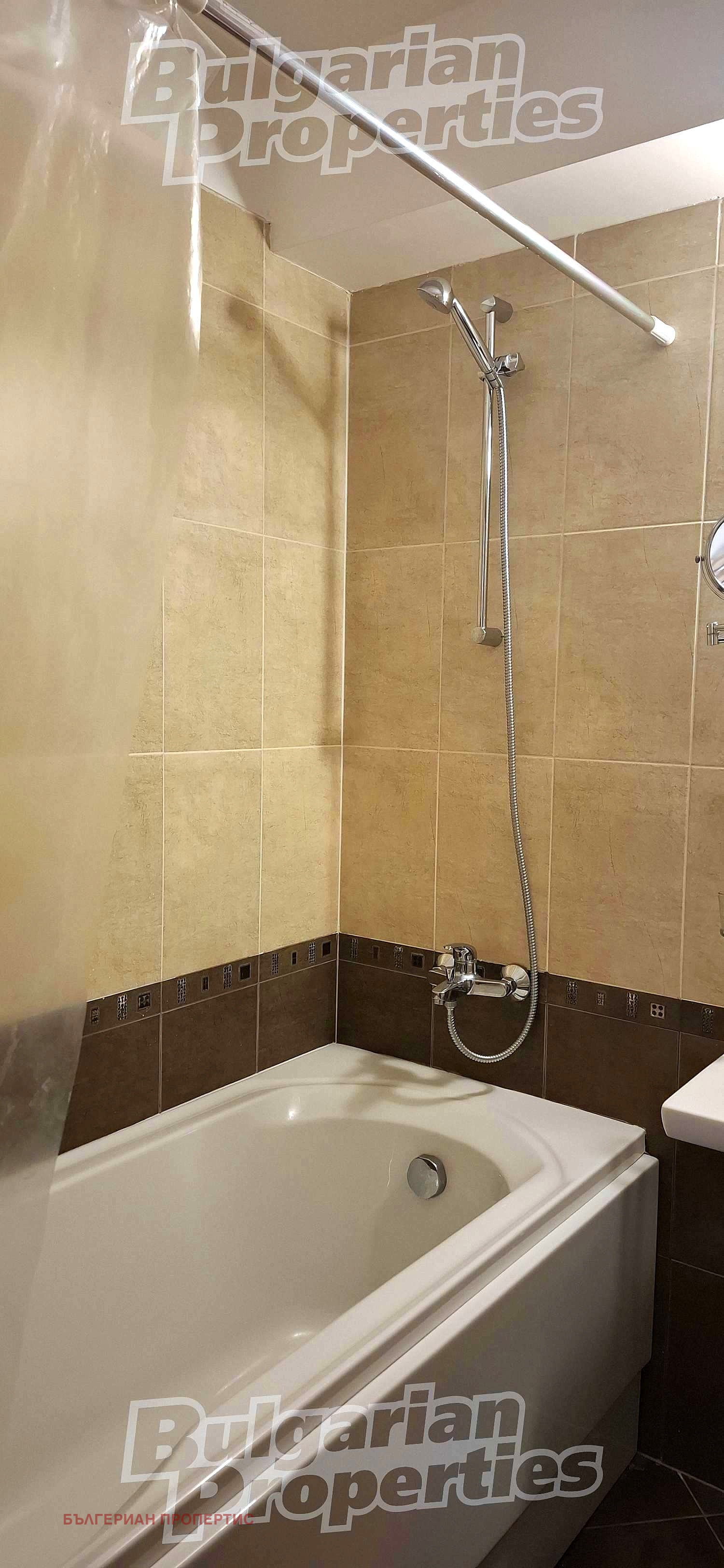 Баня с тоалетна - вана с душ, мивка с огледало, пералня, бойлер и WC моноблок