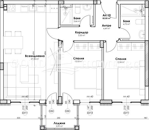 Входно антре, всекидневна с кухненски бокс, две непреходни спални, две бани с тоалетна, тераса.