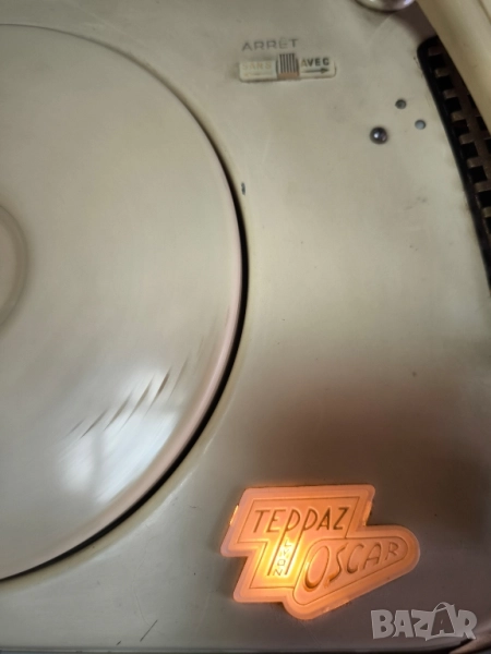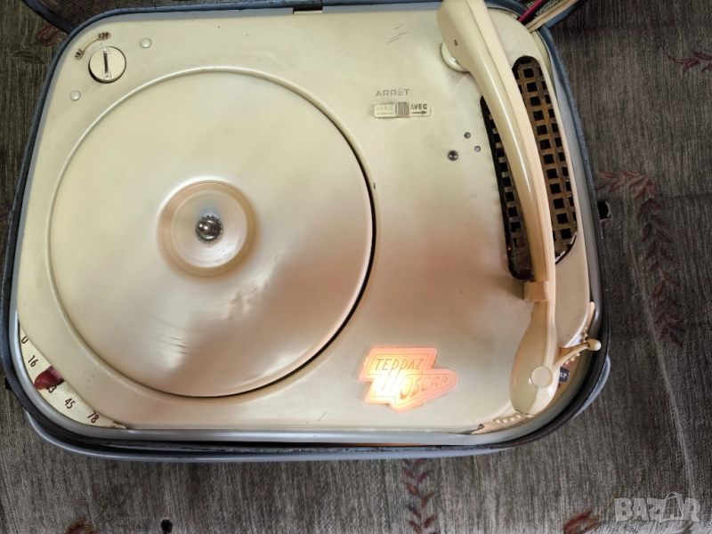 преносим грамофон Teppaz Oscar. Това е преносим грамофон от 50-те и 60-те години на миналия век, произведен във Франция. Моделът Teppaz Oscar е известен с компактния си дизайн във формата на куфарче и вградения си високоговорител. Грамофонът може да възпроизвежда плочи с различни скорости: 16, 33, 45 и 78 оборота в минута. Въпреки че е преносим, той трябва да бъде поставен на стабилна повърхност, за да работи. Перфектно работи.