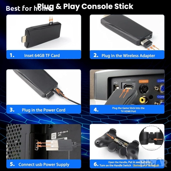 【Plug & Play】Просто свържете контролера към захранването, включете го в телевизора и включете телевизора на HD канала. Екранът със списък с игри ще се покаже на телевизора и сте готови да играете.