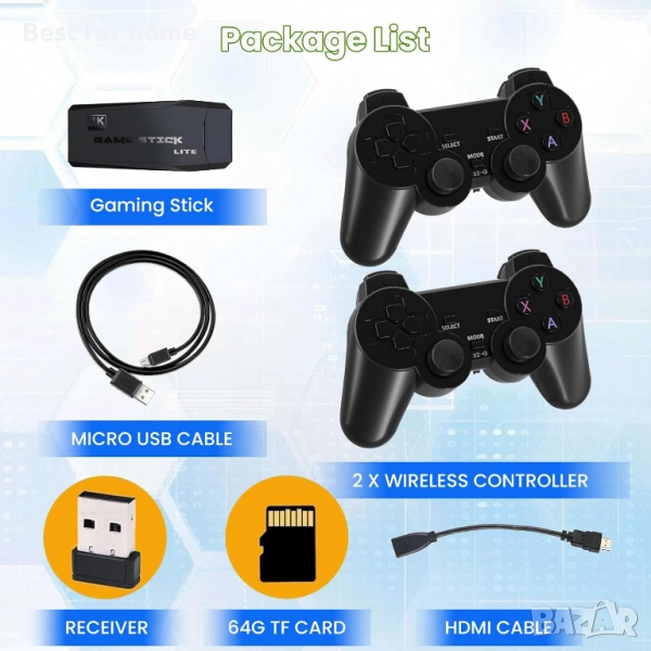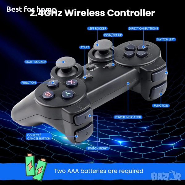 【2 геймпада】Оборудвани с 2 безжични контролера 2.4GHz, връзката е стабилна и почти без забавяне. Поддържа 2 души да играят игри едновременно, а вие можете да седнете удобно на дивана със семейството/приятелите си, за да играете любимите си игри без никакви смущения от кабели (2 безжични контролера изискват инсталиране на 4 AAA батерии, които не са включени в комплекта)