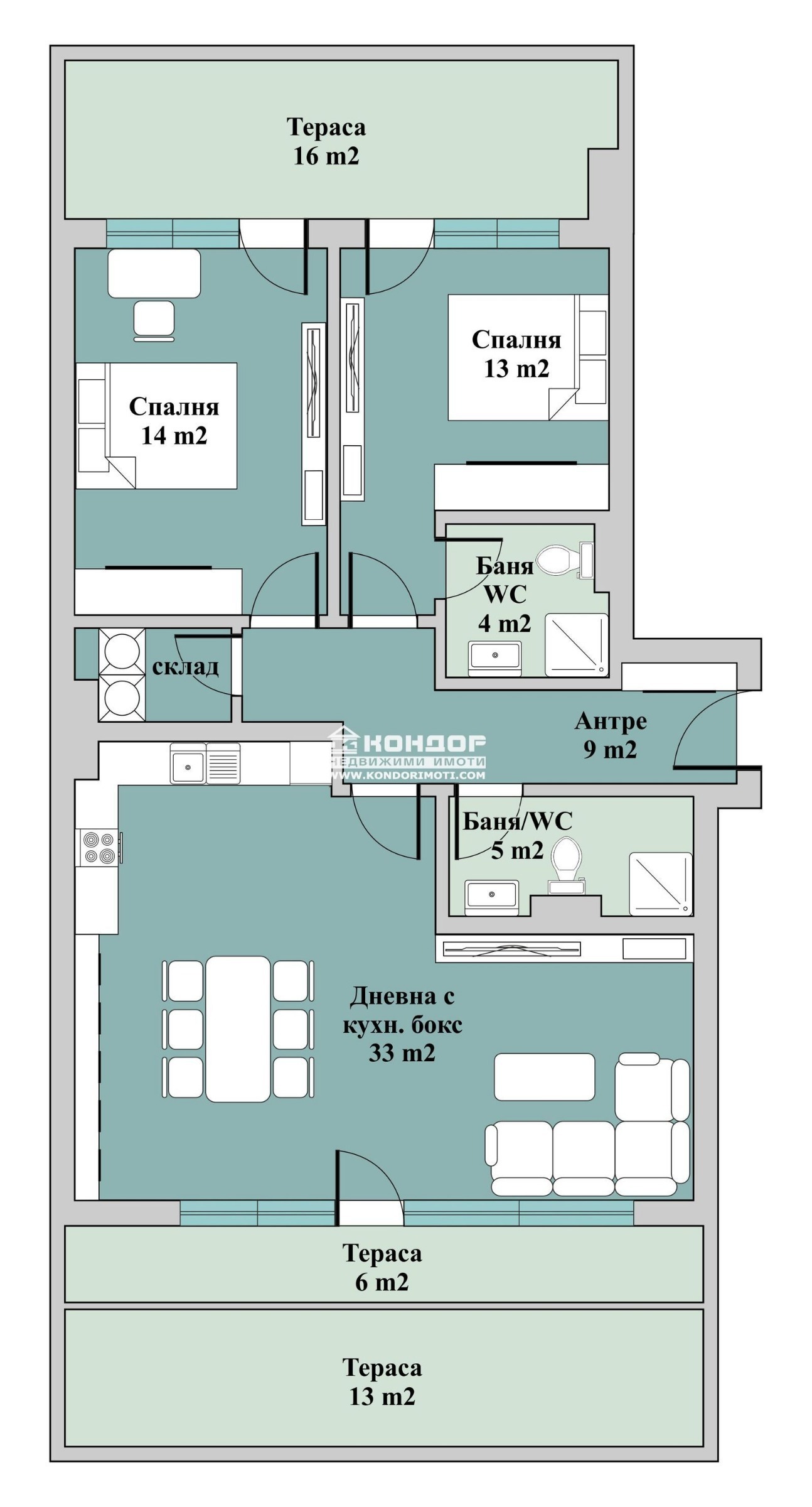 Предлагаме ви тристаен апартамент в сграда с АКТ 16, състоящ се от светла източна дневна с трапезария и кухненски кът - 33 м2, имаща излаз на панорамна тераса 6 м2 имаща излаз на допълнителна озеленена площ - 13 м2, родителска спалня 13 м2 с прилежаща баня с тоалетна - 4 м2, детска спалня - 14 м2, озеленена тераса - обща за двете стаи - 16 м2, втора баня с тоалетна - 5 м2, обособено перално помещение и функционално входно антре.