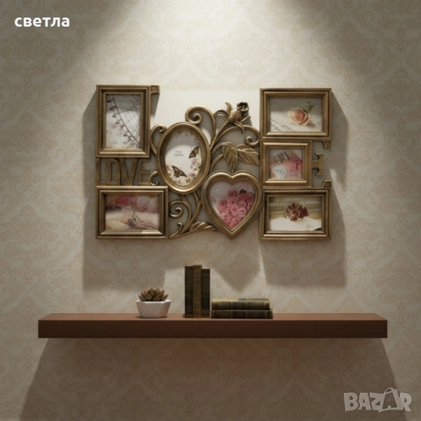 Снимките ти са разпръснати, а у дома липсва романтичен акцент? Многорамковата фоторамка Love (61×40,5 см) събира до седем снимки в различни форми – овал, сърце, правоъгълник – и ги обединява под надписа „Love“. Елегантният декоративен елемент с листа и роза подчертава темата, а изборът между бяло и антично бронзово позволява да се впише в различни интериори. Изработена от здрава пластмаса със стъклени панели, рамката се монтира лесно на стена, снимките се сменят без усилие и остават защитени от прах. Няма нужда от множество отделни рамки – получаваш цялостна композиция с един монтаж. Тя съчетава практичност и емоция, превръщайки се в акцент във всяка стая. Така подреждаш спомените си, освежаваш дома и имаш прекрасен подарък за близки.