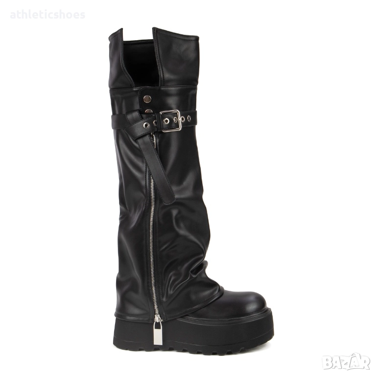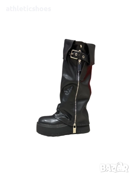 Дамски ботуши с платформа,подвижни декорации и цип от външната страна,цип и от вътрешната страна за лесно обуване.Създадени за жени, които обичат да изглеждат зашеметяващо и не правят компромис с удобството. Стил ,комфорт и височина -всичко в една крачка.Перфектни за градския стил или вечерно излизане.