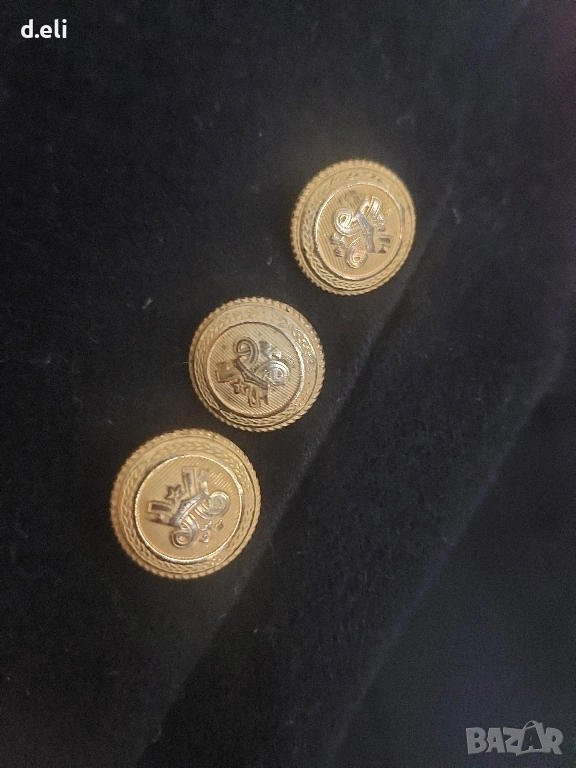 Съставено златни копчета на ръкавите и двуредово закопчаване.