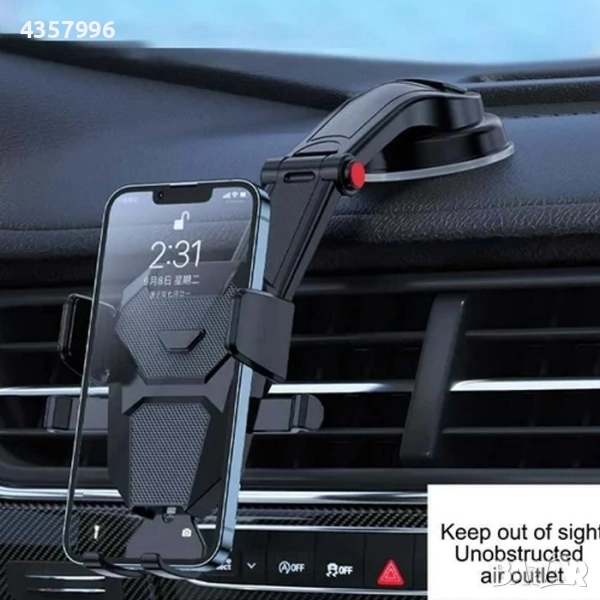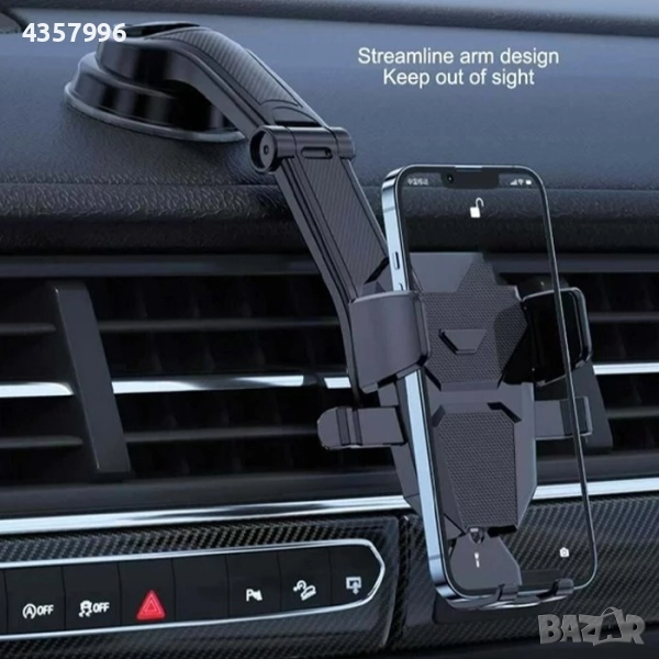 Универсална стойка за телефон с вакуум и удължено рамо, за по-добра видимост.